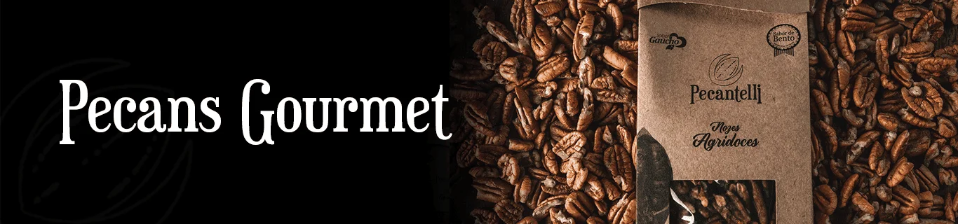 Nozes pecan caramelizadas, agridoce e drageadas com chocolate. Feitas com nozes selecionadas.