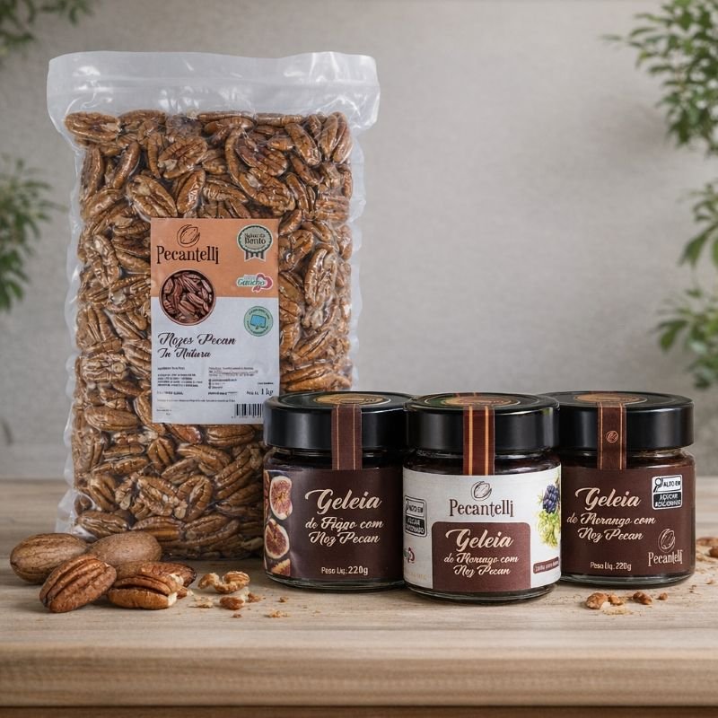 O Kit Gourmet Pecantelli reúne a nobreza da Noz Pecan in natura com três geleias artesanais que equilibram doçura, textura e sofisticação em cada detalhe.