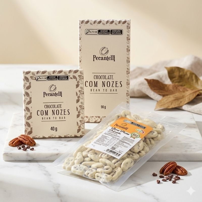 Os tabletes ao leite com noz pecan revelam um chocolate artesanal de alta qualidade, com perfil suave e envolvente, enquanto as drágeas com chocolate branco 36% entregam um contraste delicado e levemente adocicado, realçando ainda mais o sabor natural da pecan.